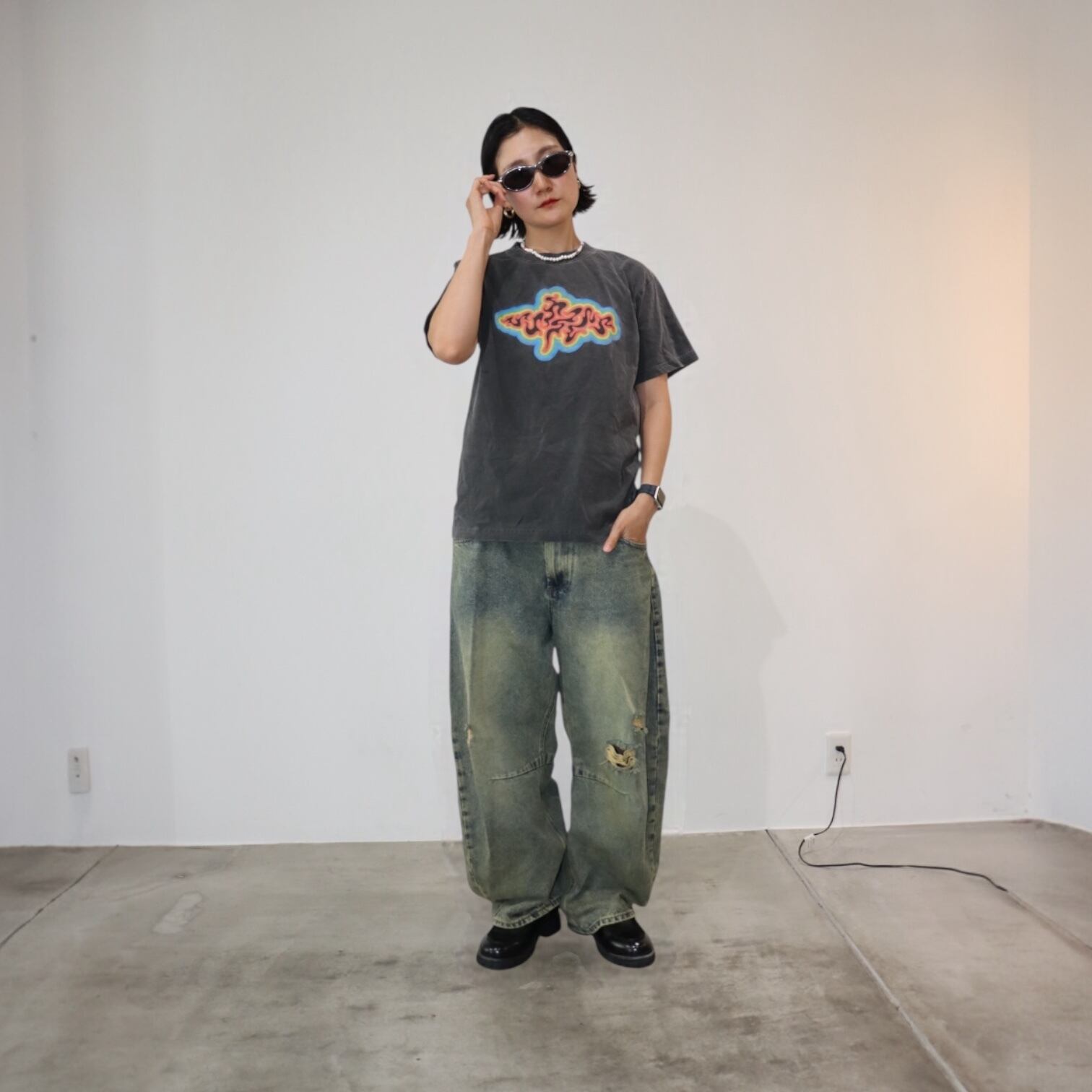 GINz BROS WORKS ORIGINAL PRODUCT T-shirtになります。やや色が抜けたvintage Tのような風合いを出すためにエイジング加工を施しております。部分部分色抜けしたプリントや、日差しにさらされてサンフェードしたようなクタクタ感があり、魅力たっぷりの一着です!